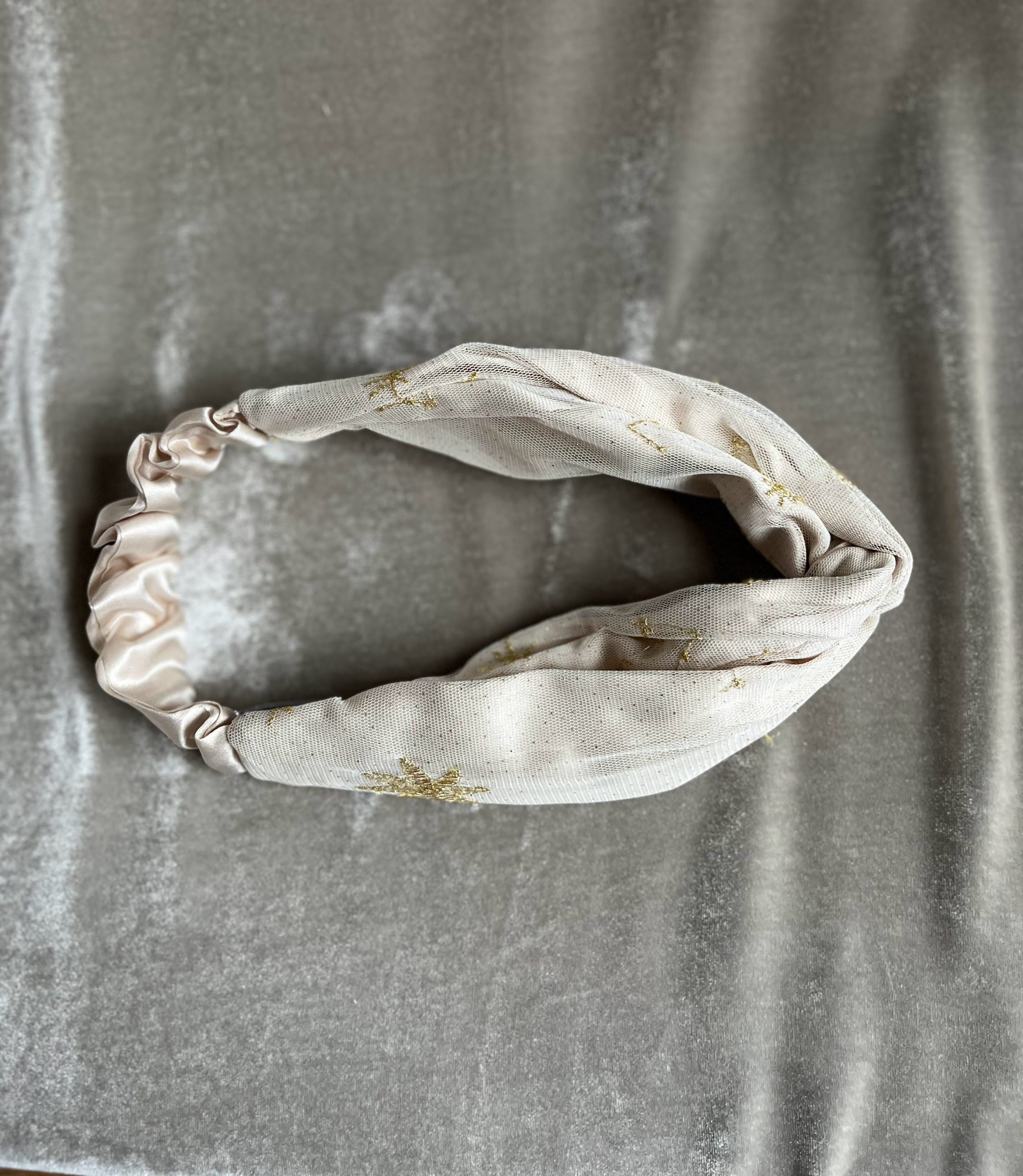 Ivory silk satin zero waste headband made from silk and lace offcuts