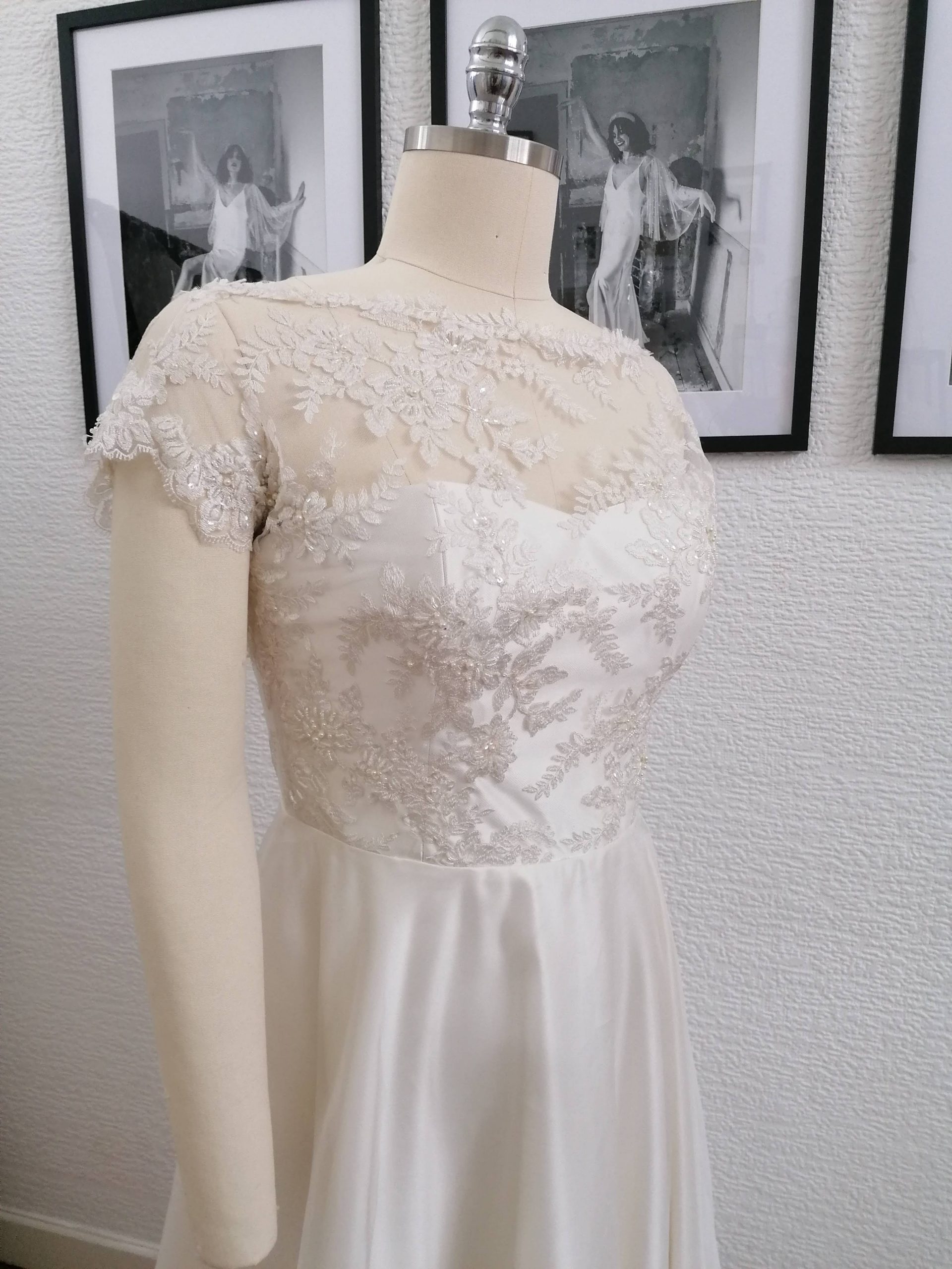 A satin and silk organza mini dress with vintage-inspired details, perfect for a retro-themed wedding.